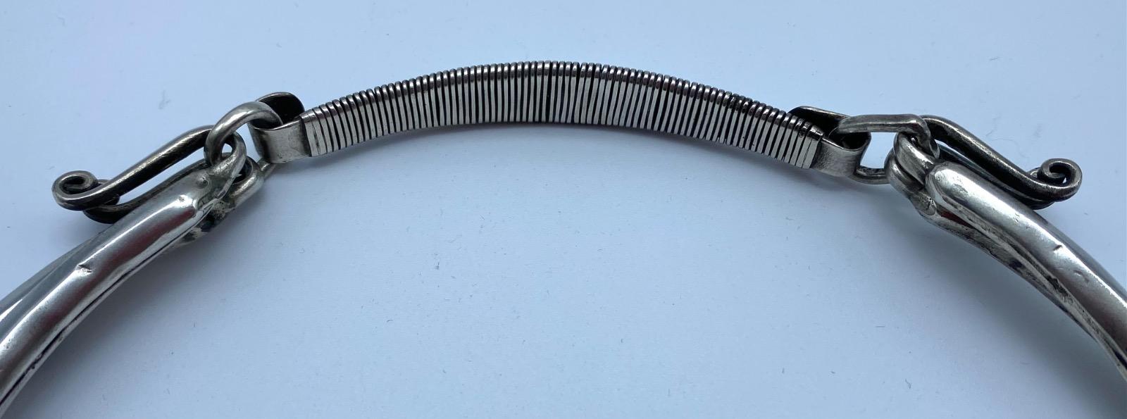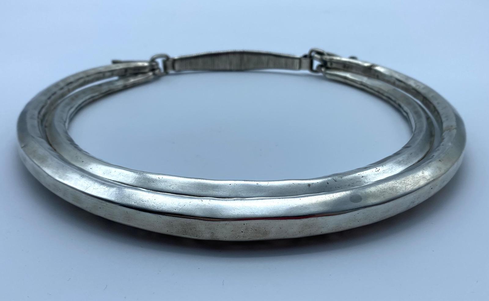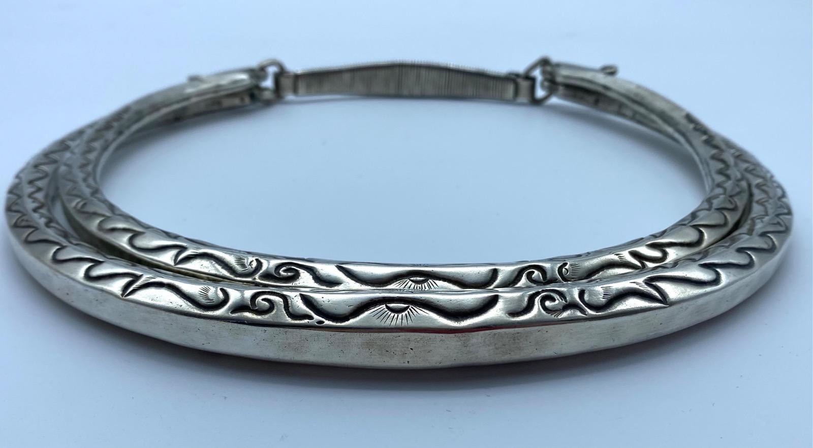 A high quality silver alloy (mostly between 40-60 % silver with nickel) dubbel ringed heavy necklace in very good condition classically decorated with stylized dragons.