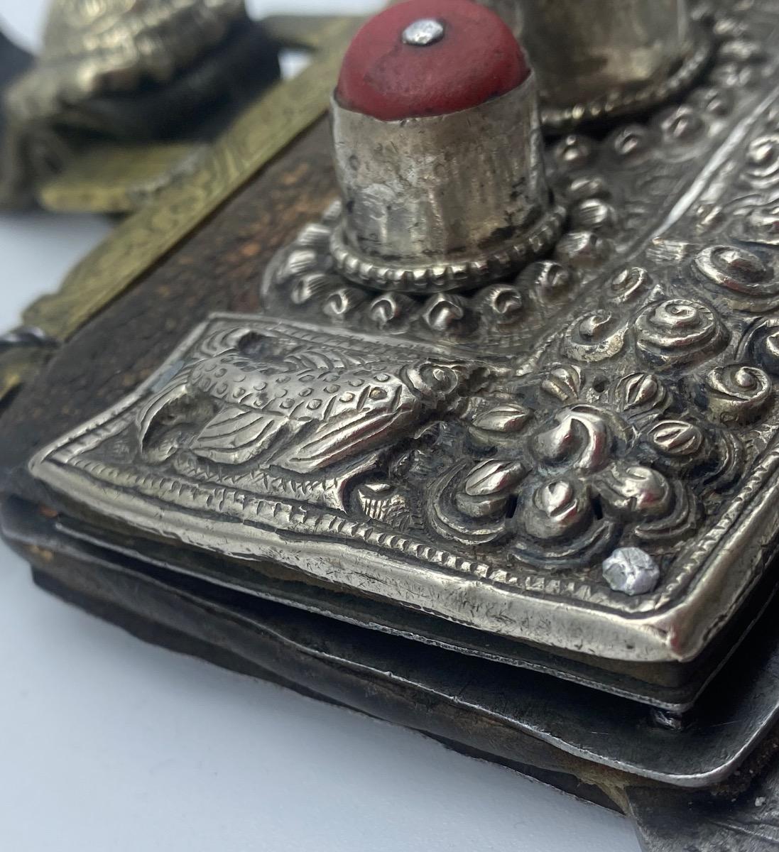 Rare antique large Tibetan Mechag flint pouch Himalayan silver and coral