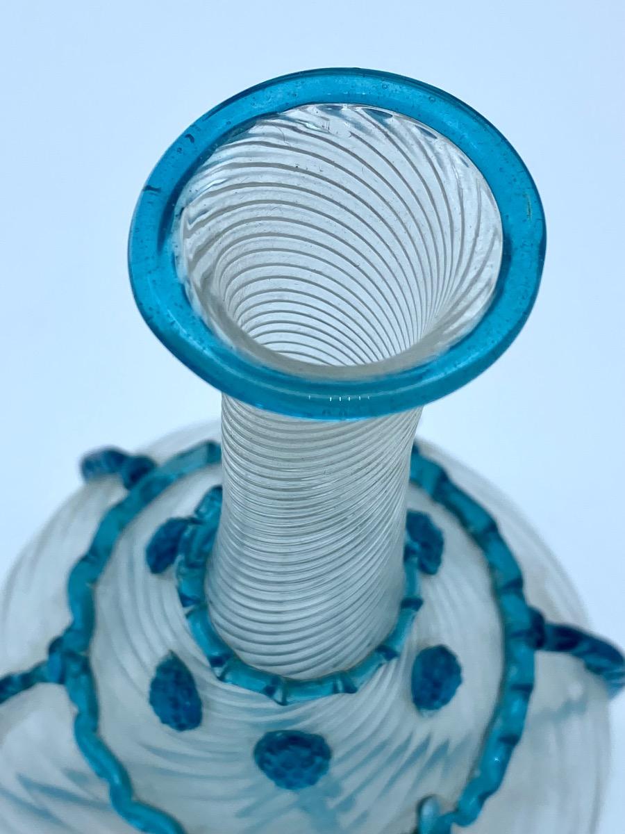 A rare 20,5 cm height clear glass blown Murano bottle, featuring swirl and twisted form with cobalt blue glass embellishments and rosettes. This bottle had a wide belly that slopes up into a long and elegant neck. An example of the finest 18th century Venetian art glass.