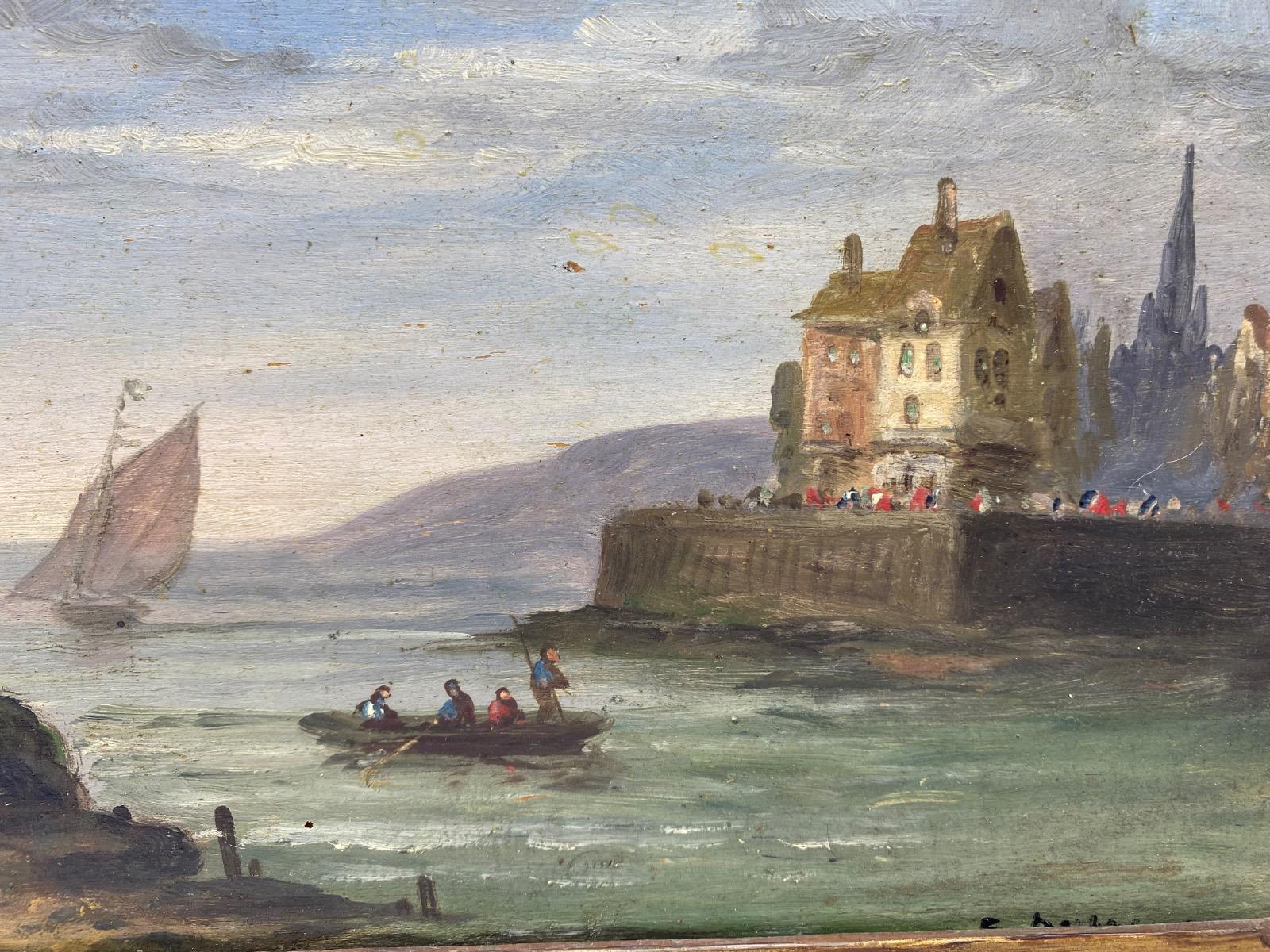 A nice pair of signed oil on wood marine paintings depicting most surely harbor towns on the Normandy coast. In their original wooden frames.