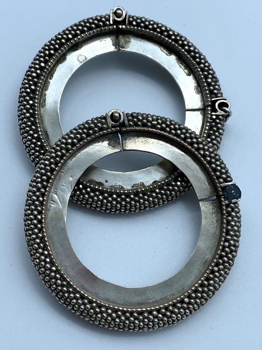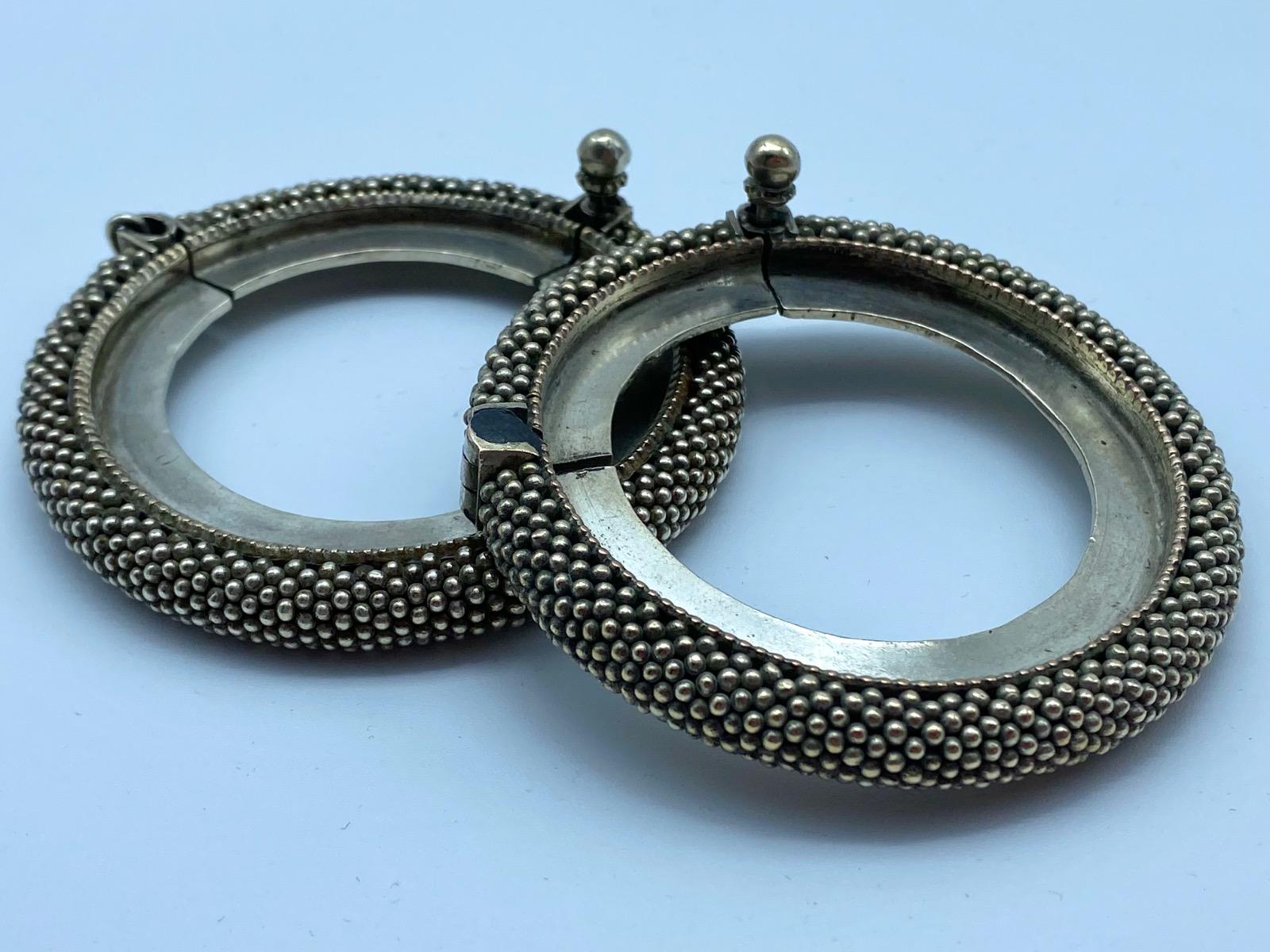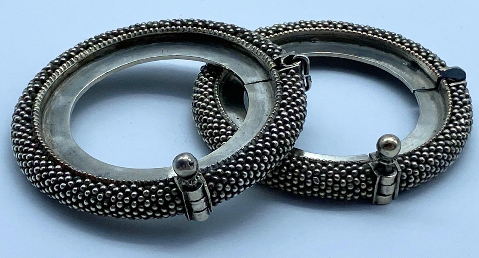 A very near pair of heavy hinged pin silver bracelets that were handmade using a traditional technique called 'gajre' or 'goli': lots of very small silver massive balls which aren't welded to the base but attached with a silver wire that leaves them slight movement.