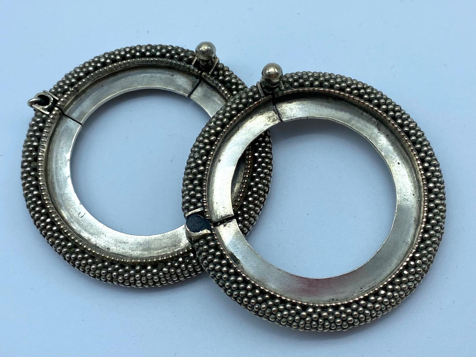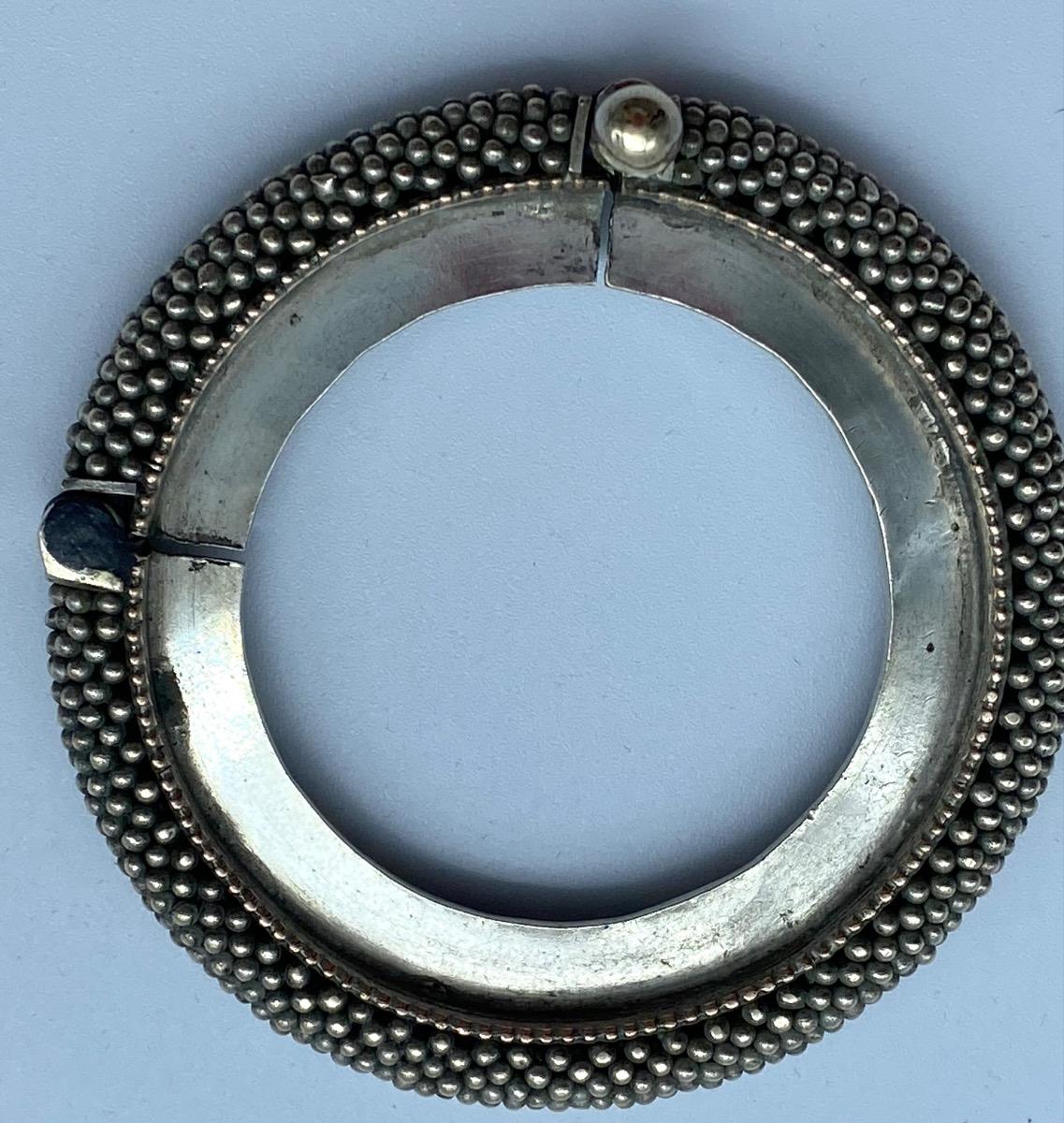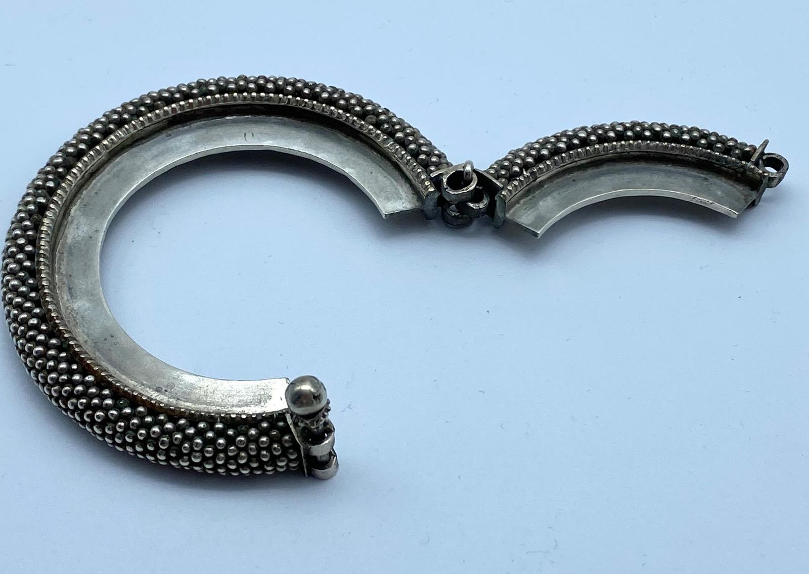 A very near pair of heavy hinged pin silver bracelets that were handmade using a traditional technique called 'gajre' or 'goli': lots of very small silver massive balls which aren't welded to the base but attached with a silver wire that leaves them slight movement.