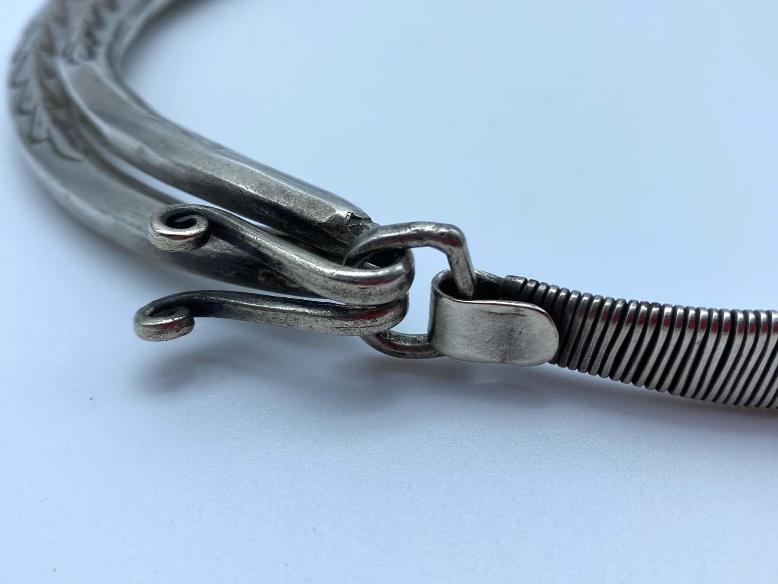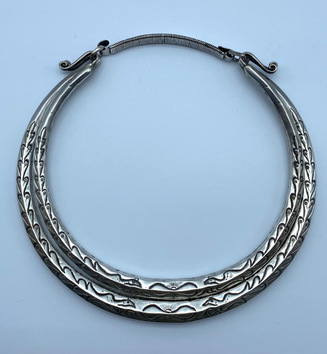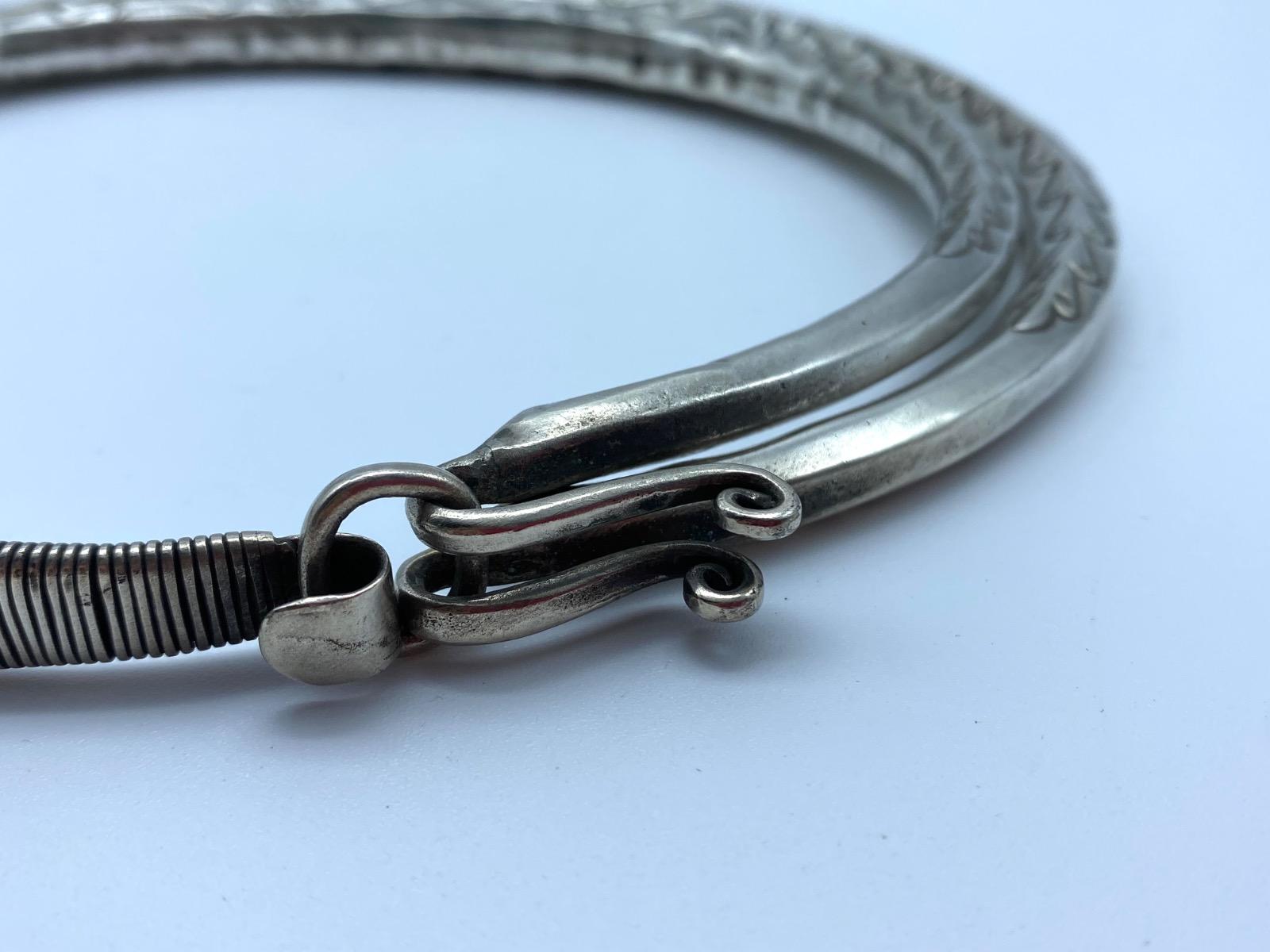 A high quality silver alloy (mostly between 40-60 % silver with nickel) dubbel ringed heavy necklace in very good condition classically decorated with stylized dragons.