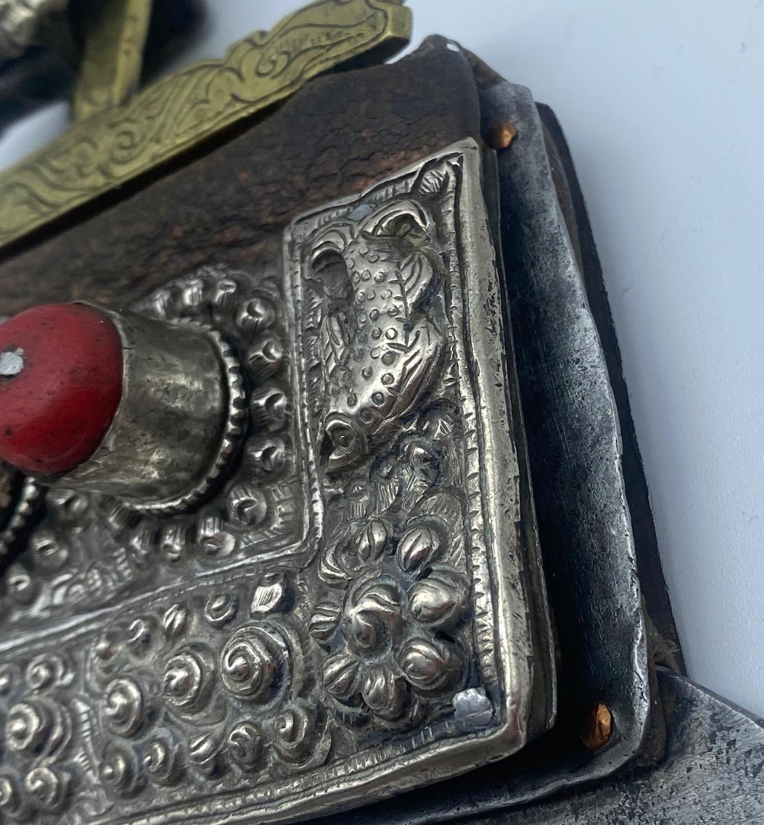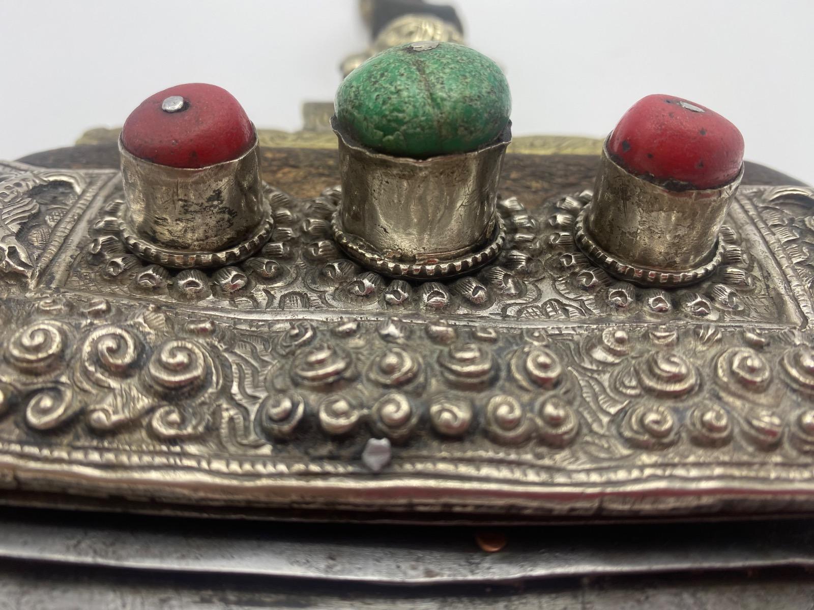 Rare antique large Tibetan Mechag flint pouch Himalayan silver and coral
