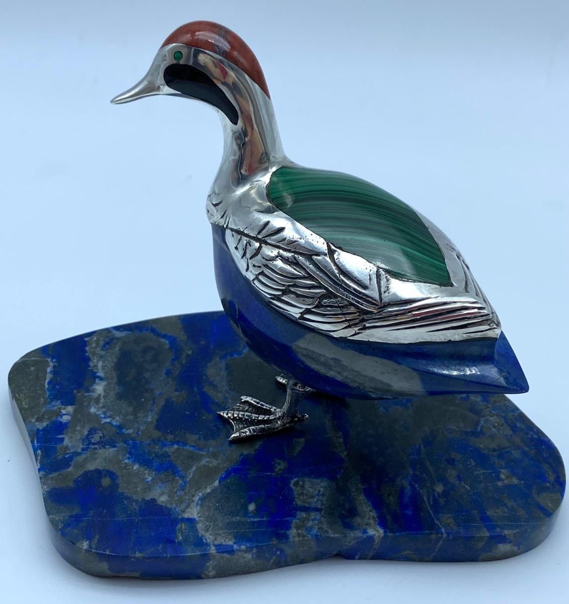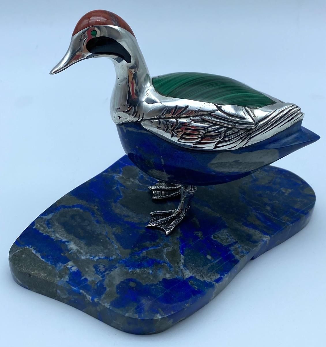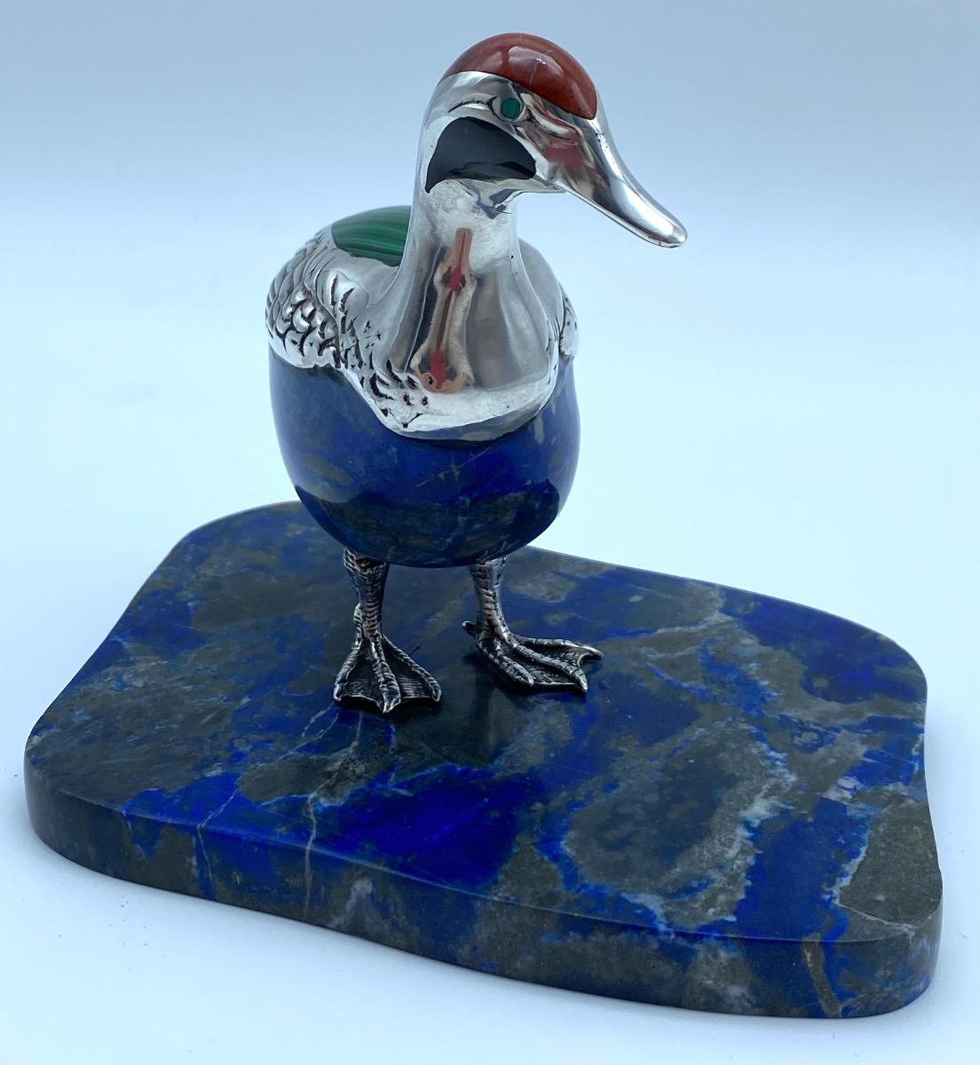 A lapis lazuli carved duck, laid in with red jaspis, malachite and black agate adorned with silver feathers and feet. The lovely figure stands on a lapis lazuli base.