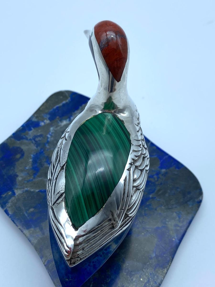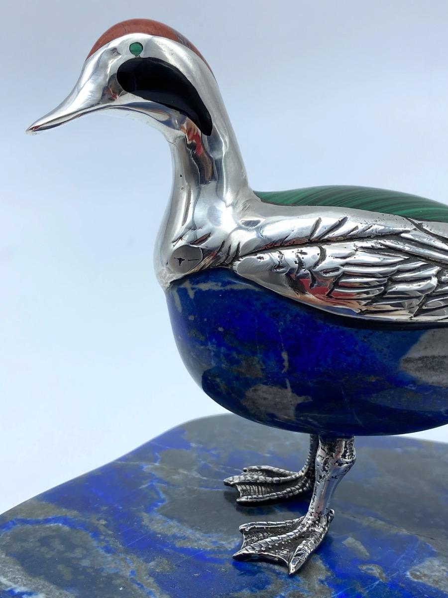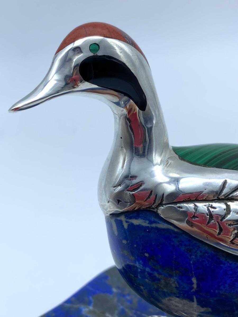 A lapis lazuli carved duck, laid in with red jaspis, malachite and black agate adorned with silver feathers and feet. The lovely figure stands on a lapis lazuli base.