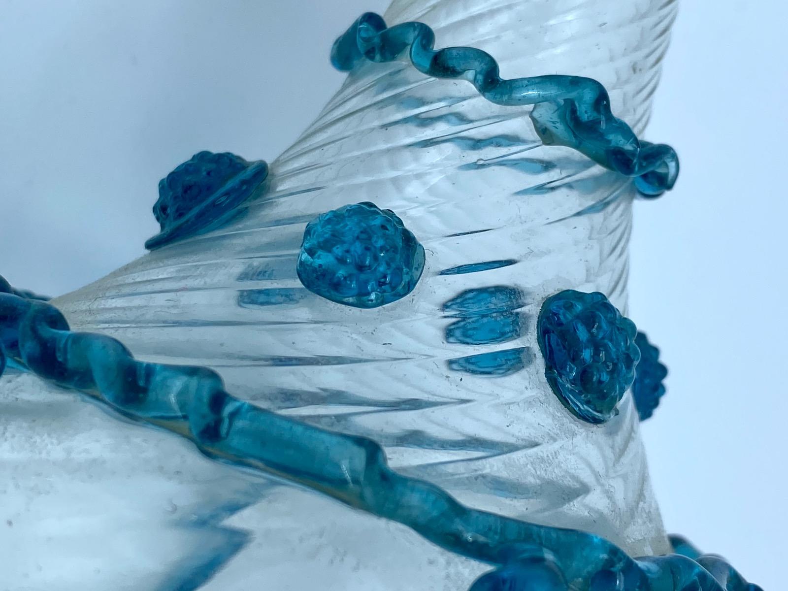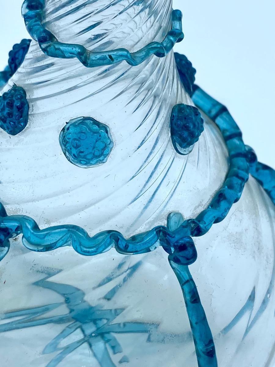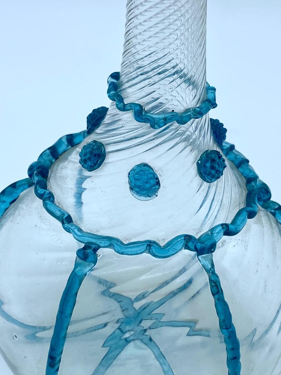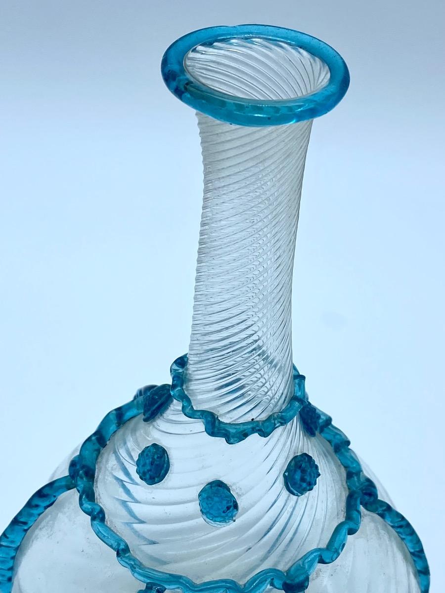 A rare 20,5 cm height clear glass blown Murano bottle, featuring swirl and twisted form with cobalt blue glass embellishments and rosettes. This bottle had a wide belly that slopes up into a long and elegant neck. An example of the finest 18th century Venetian art glass.