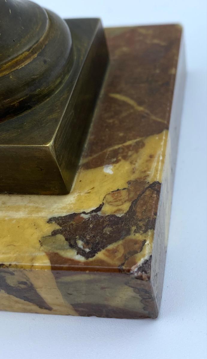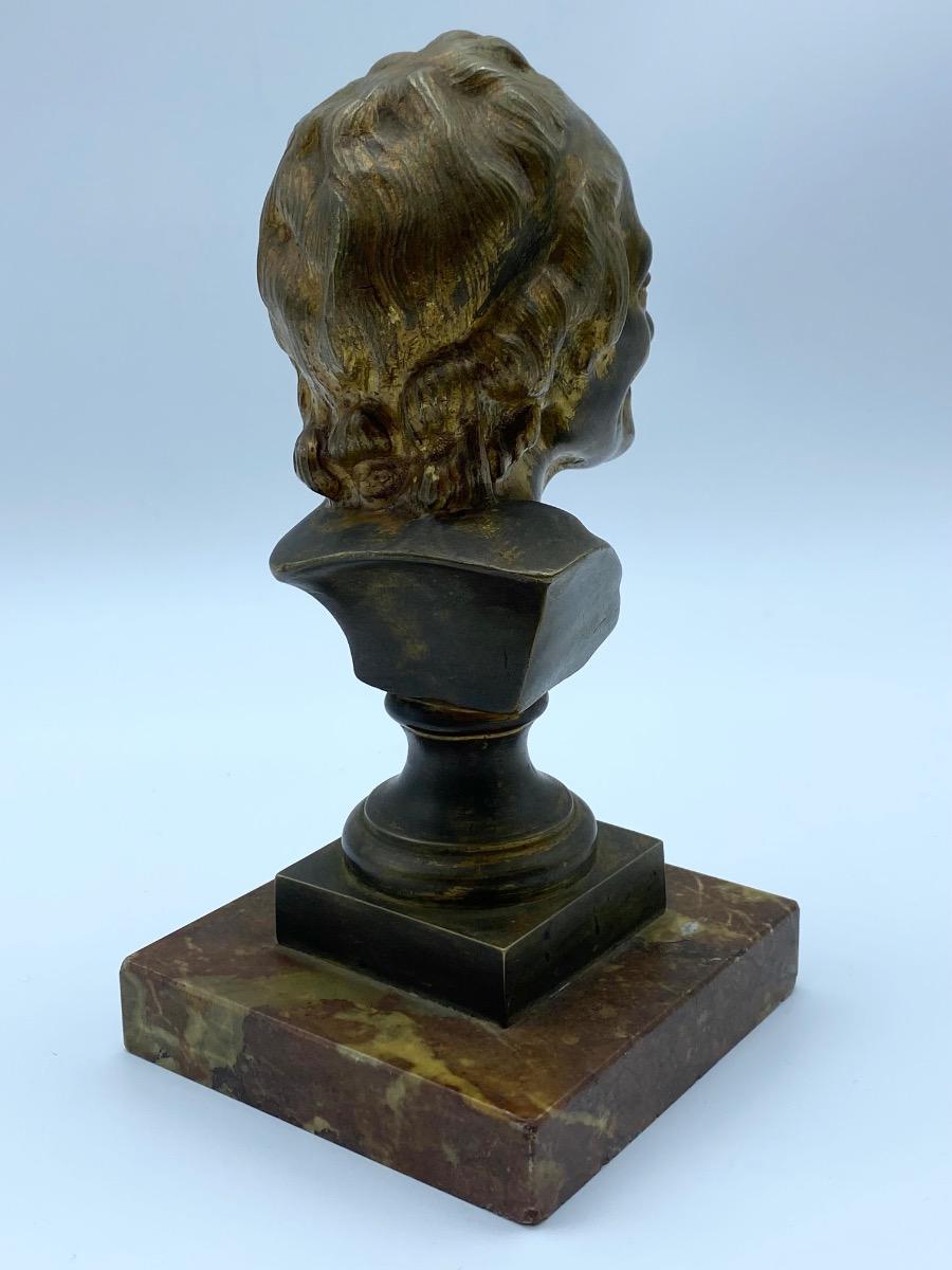 This bronze bust with many traces of gilding is mounted on a marble base (minor chips to the base) and in good order. One small dent in the foot of the bust but hardly noticeable.