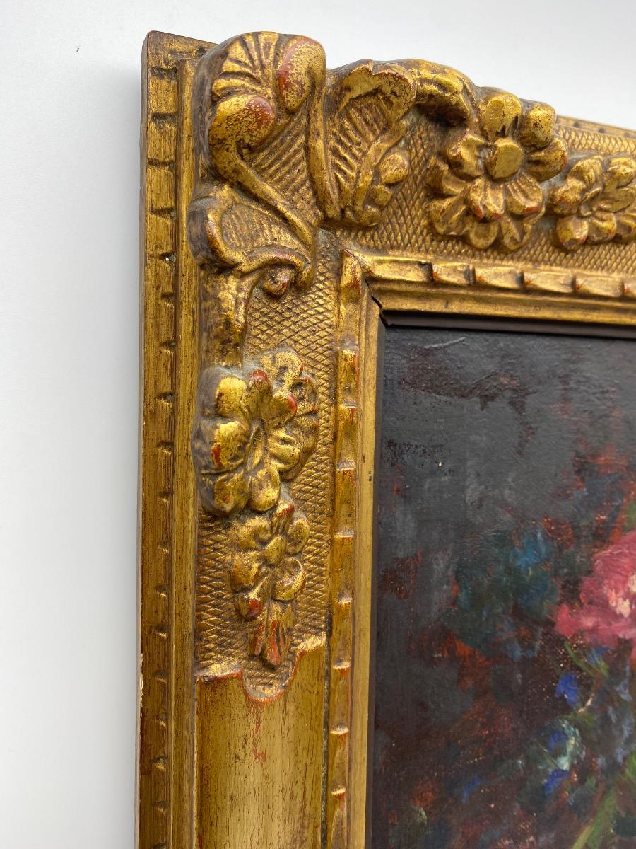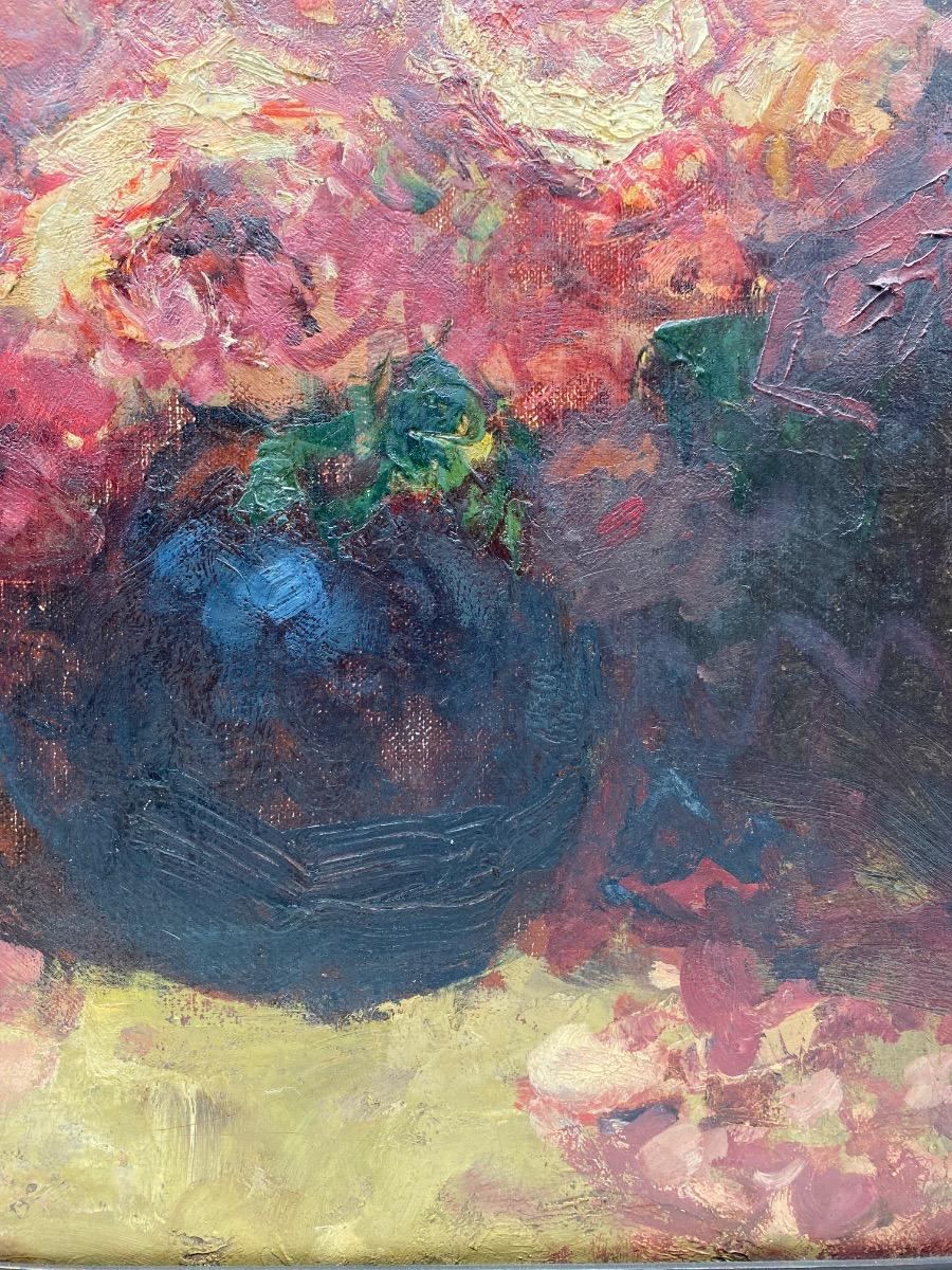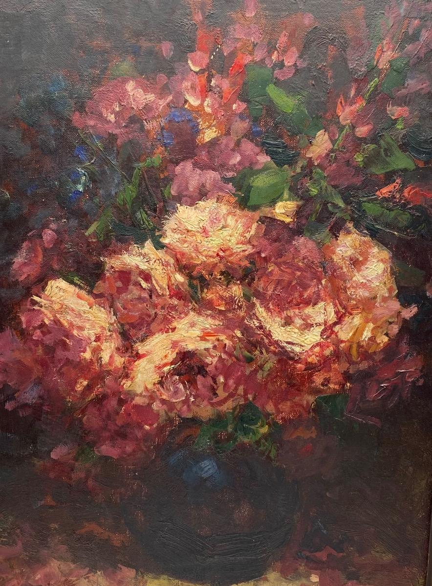 A beautiful oil on canvas painting depicting a bouquet of flowers with an abundance of pink roses.