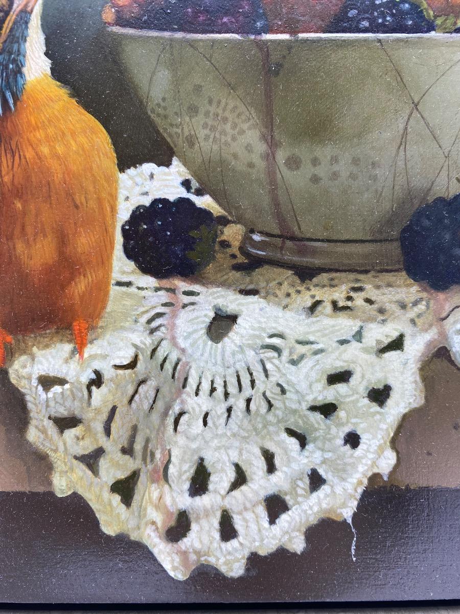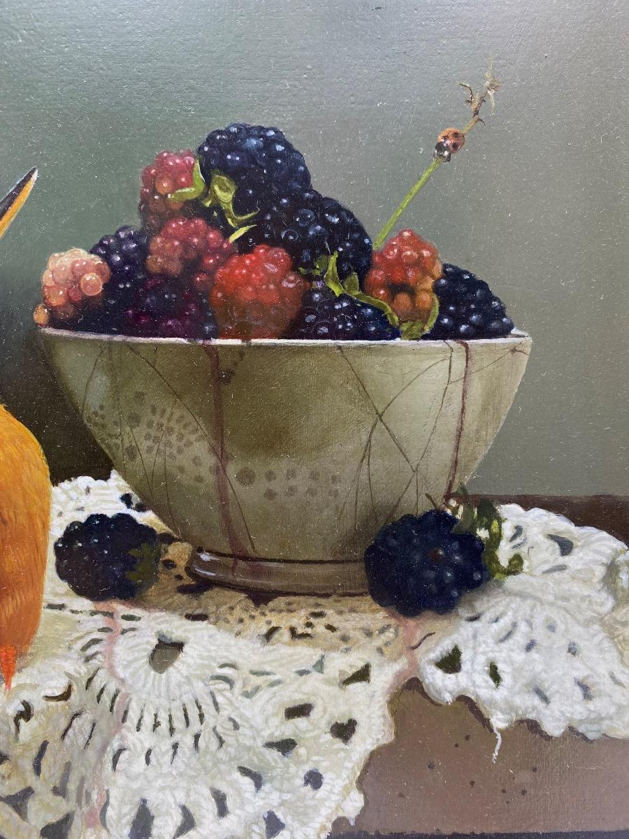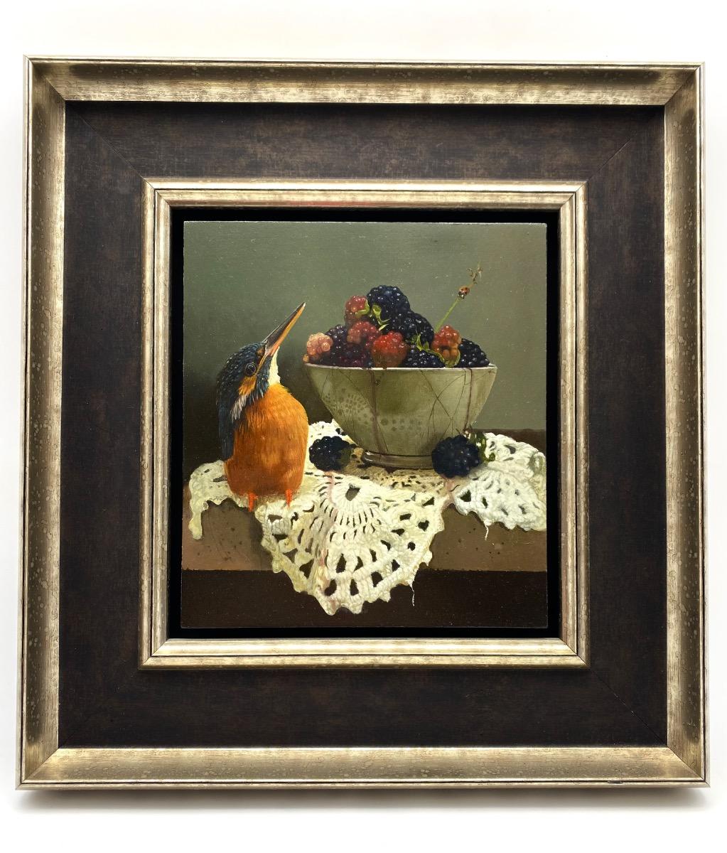 A rare and beautiful little artwork by the internationally renowned artist Gressie, oil on panel depicting one of his 'painted stories' with animals and fruit: a kingfisher sittIng proudly next to an antique porcelain bowl with life like strawberries and raspberries.