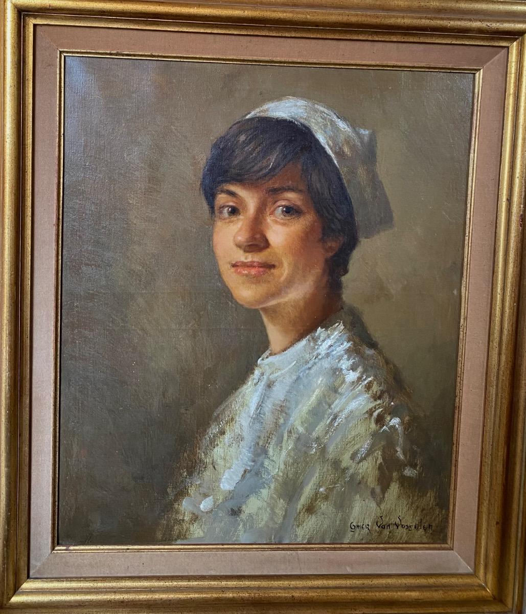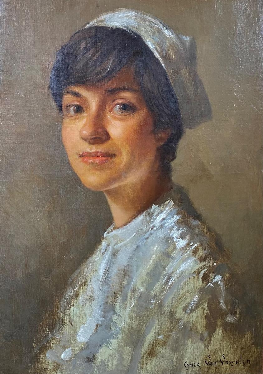 A high quality oil on canvas female portrait painting by renowned portraitist Omer van Vosselen.