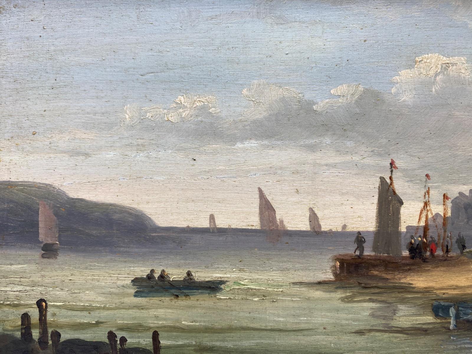 A nice pair of signed oil on wood marine paintings depicting most surely harbor towns on the Normandy coast. In their original wooden frames.