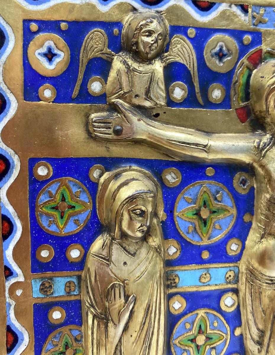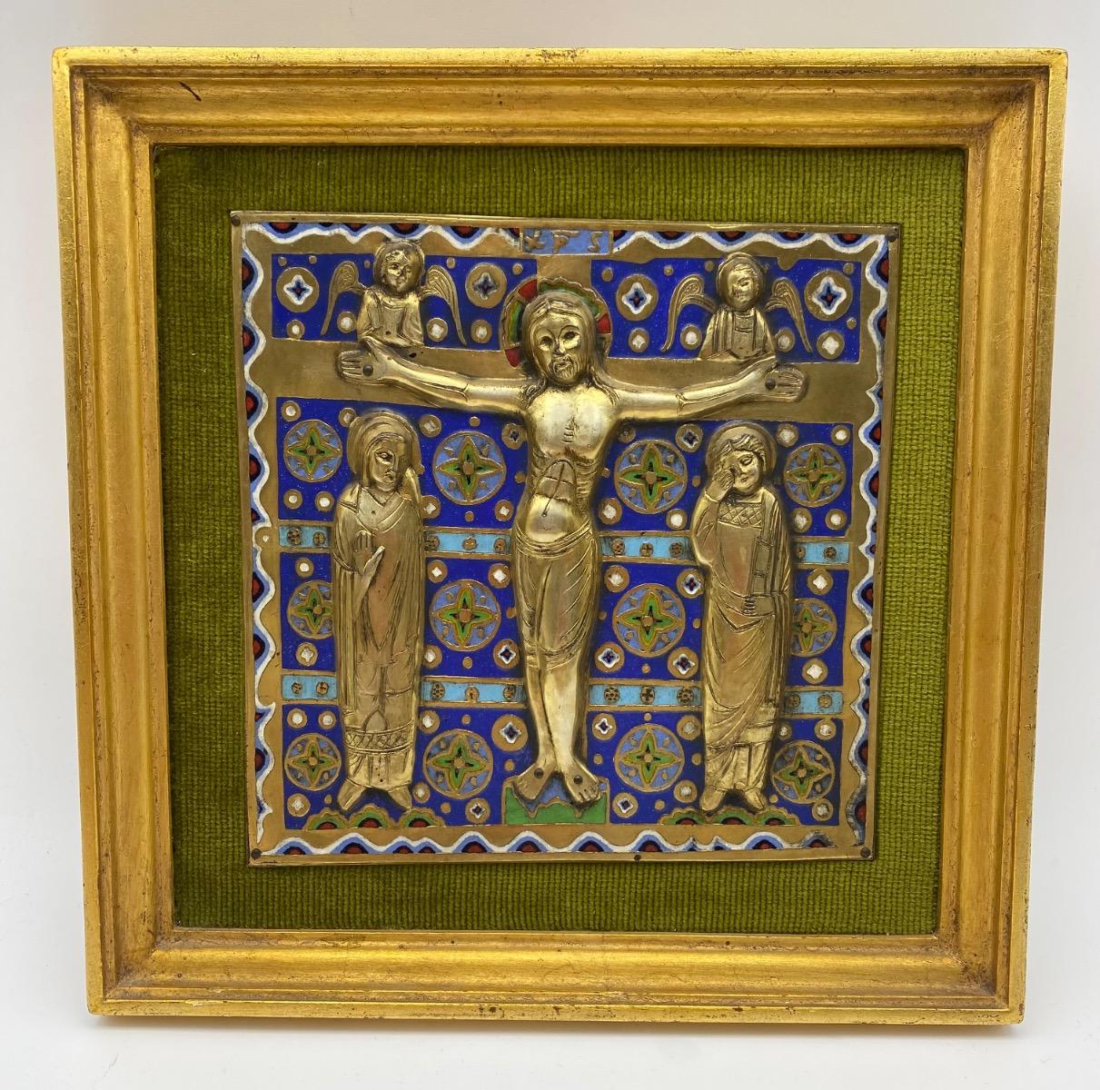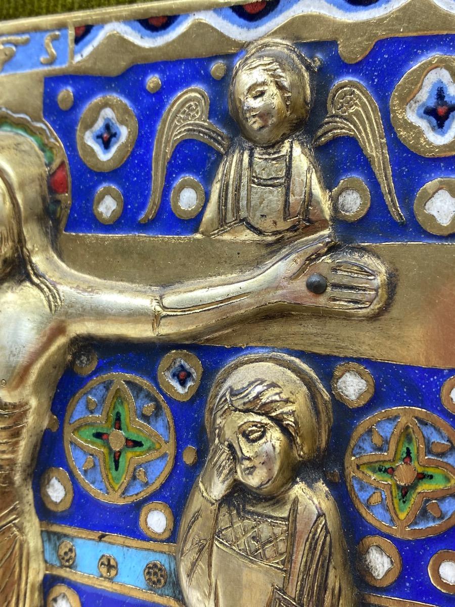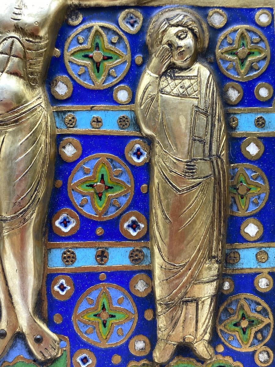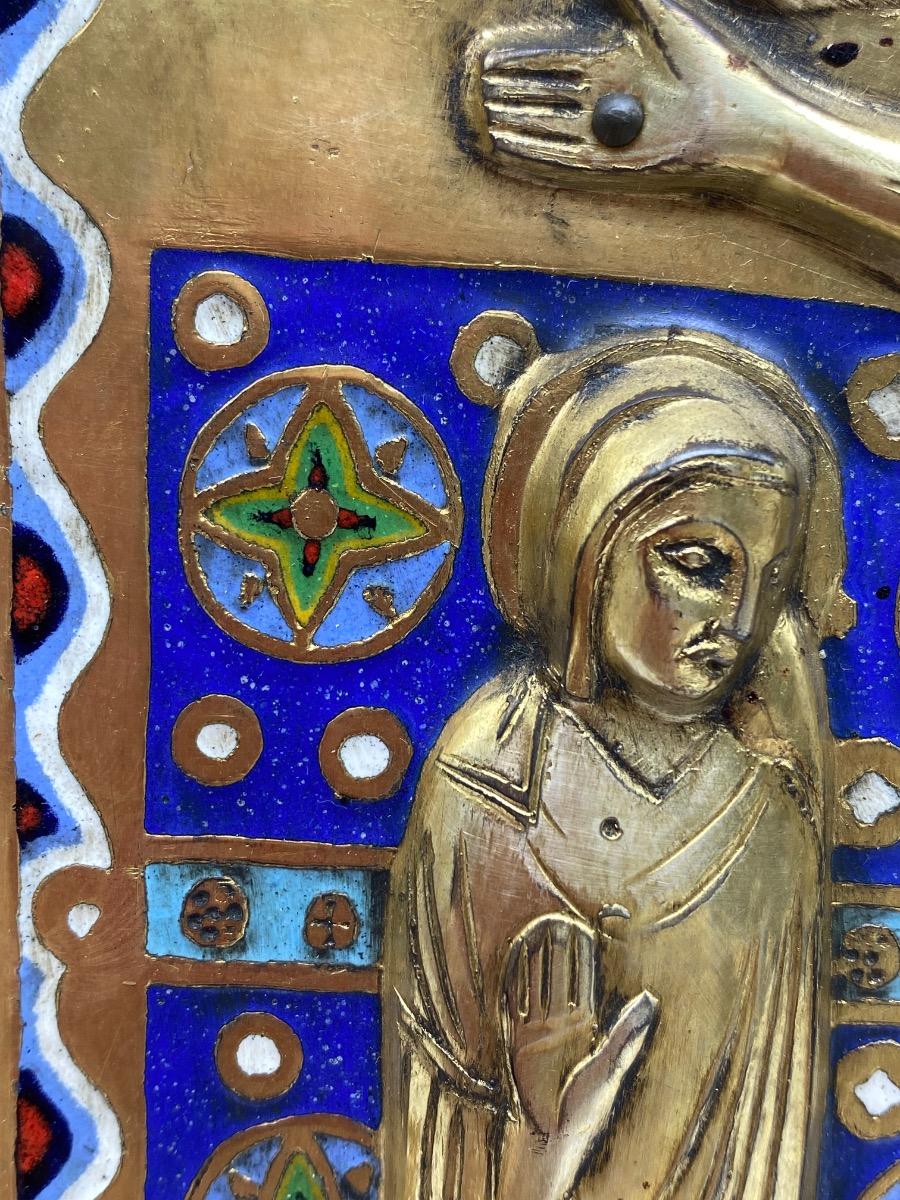 Limoges style Haute Epoque Ojer enameled crucifixion plaque